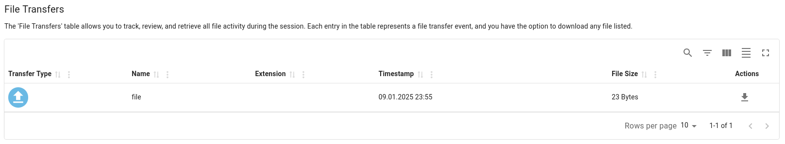 Clicking on a session opens its details page, where you can download the recording or transcript. This page also includes a "File Transfers" table that logs all files uploaded or downloaded during the session.