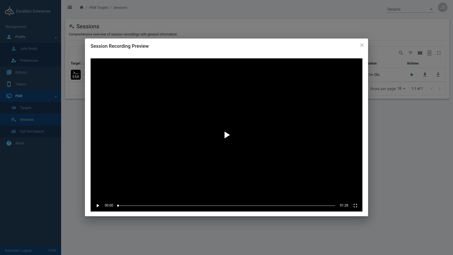 The PAM section is where you access secure company resources (PAM Targets). All sessions are recorded, and every action you take is digitally signed to ensure security and accountability.
