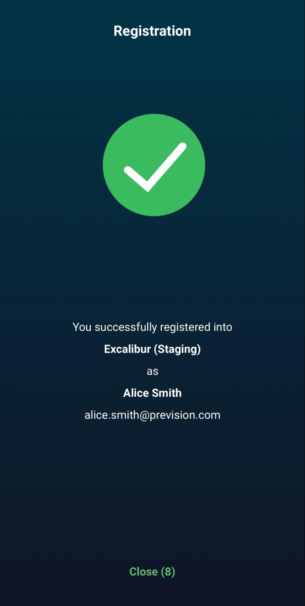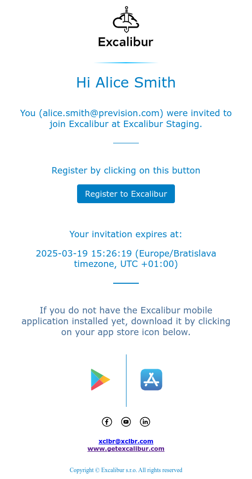 The Registration process creates a secure link between the Excalibur app on your phone and your company's Excalibur system. To begin, a system administrator will send you an invitation email.
