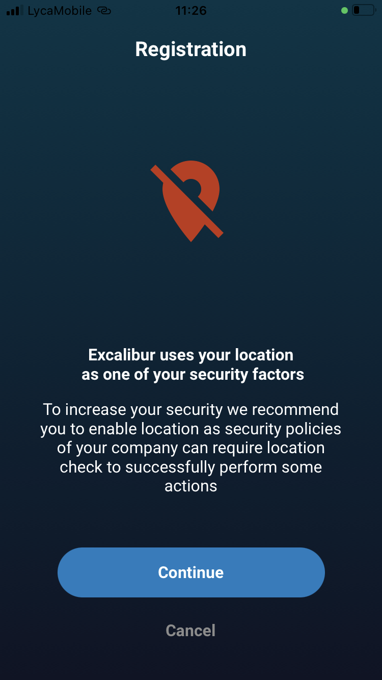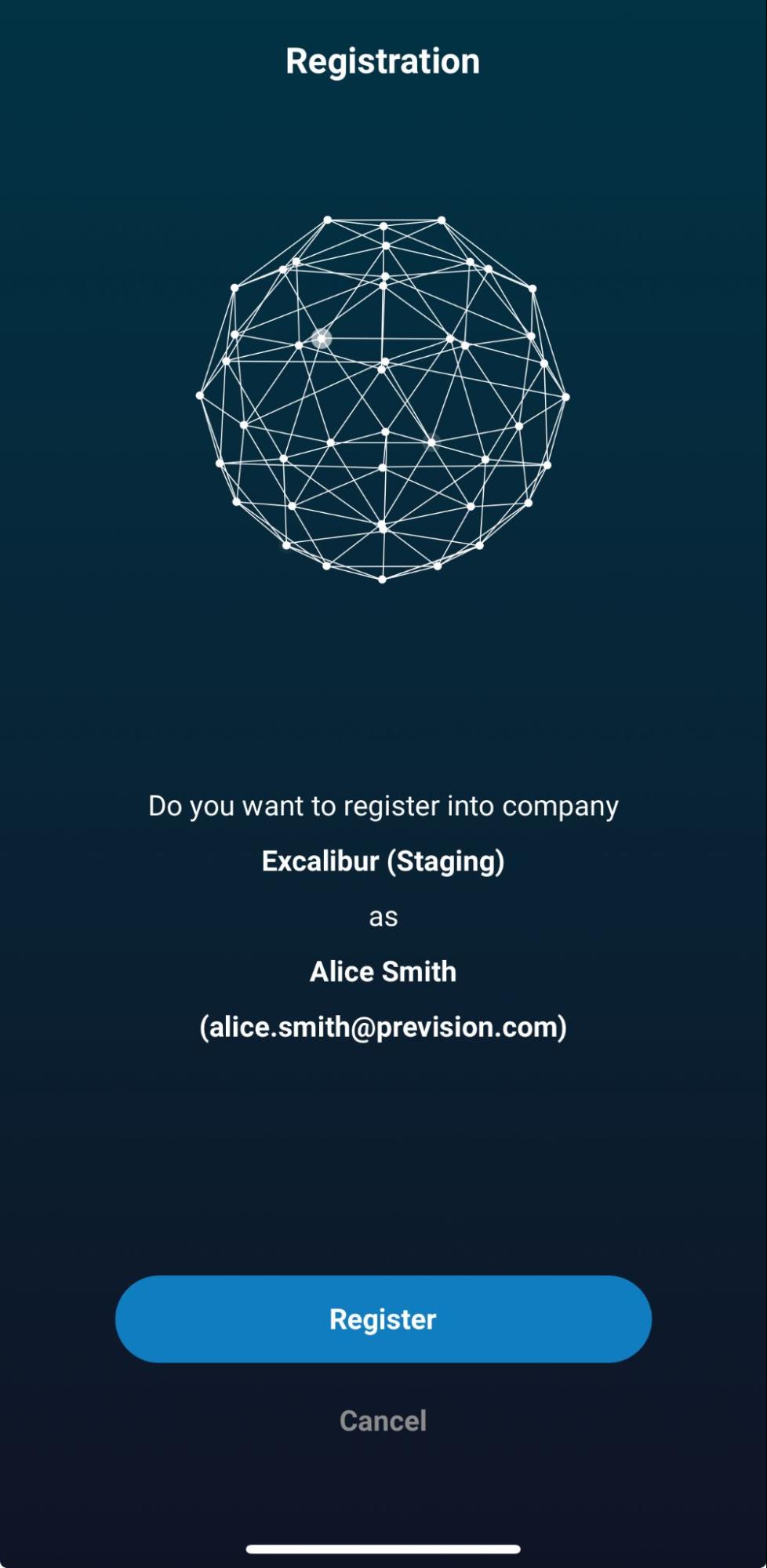 The Registration process creates a secure link between the Excalibur app on your phone and your company's Excalibur system. To begin, a system administrator will send you an invitation email.