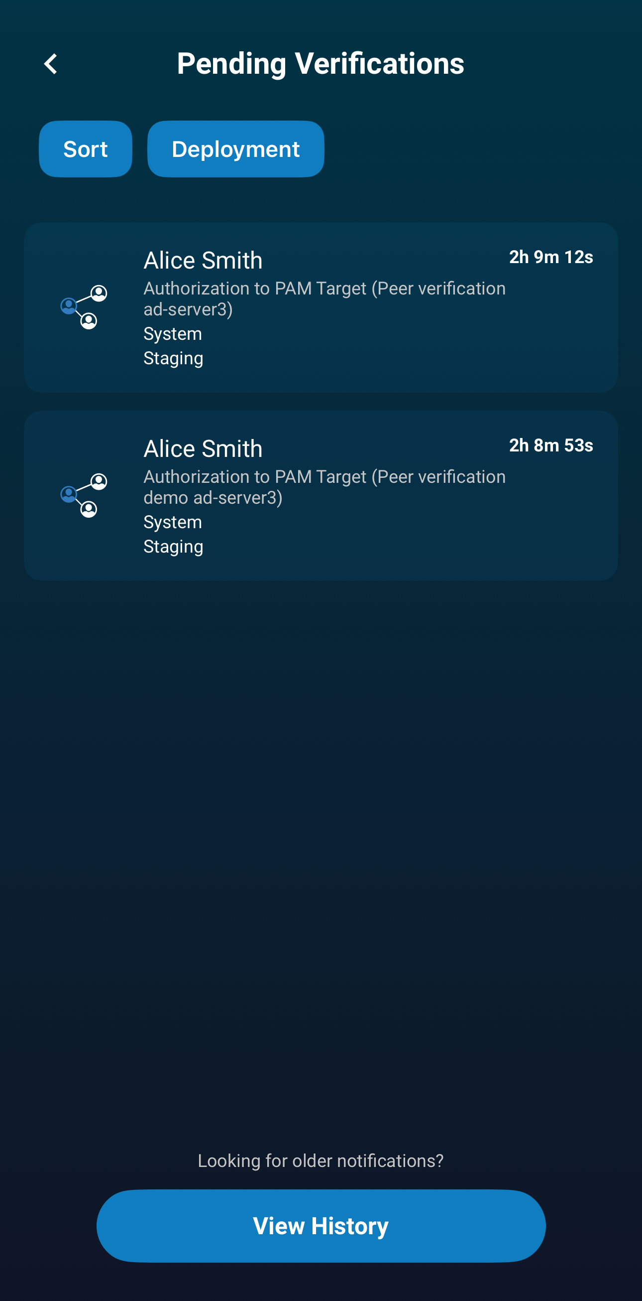 You will receive notifications when there are Peer Verification or Just in Time Access requests from other users. To view your notifications, tap the bell icon in the main screen.