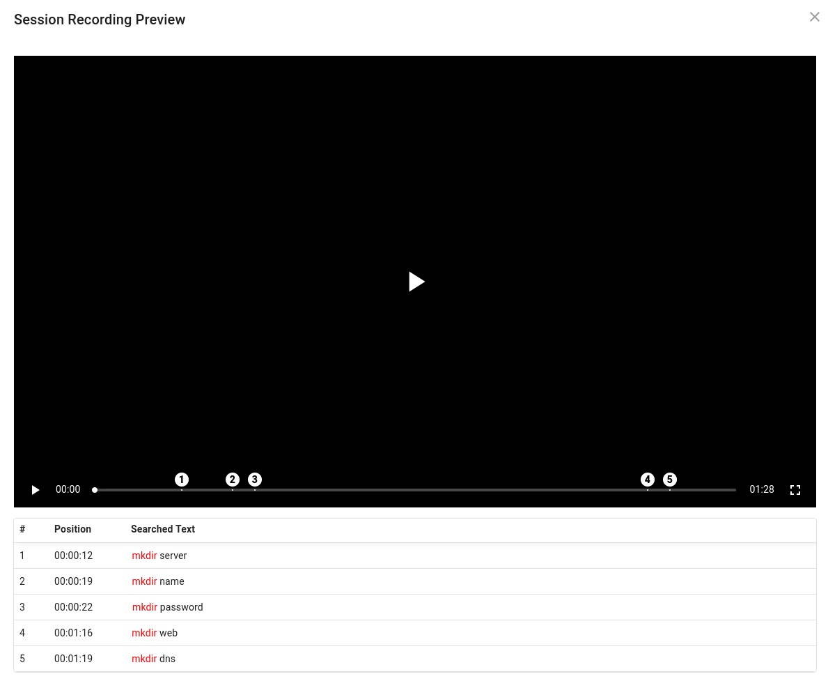 Sessions capture key events such as session start/end, file uploads and downloads, user inputs action including typed input, copy and paste from clipboard. You can use the built-in searchable history to find specific actions or inputs. You can also filter events by key events.