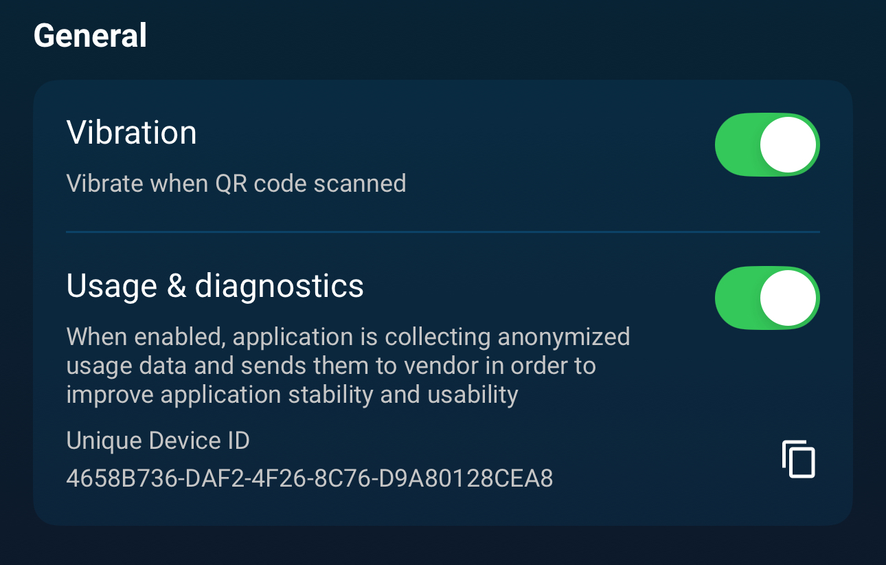 In this section, you can customize the app's behavior by enabling or disabling Vibration for feedback and choosing whether to share Usage and diagnostics data.