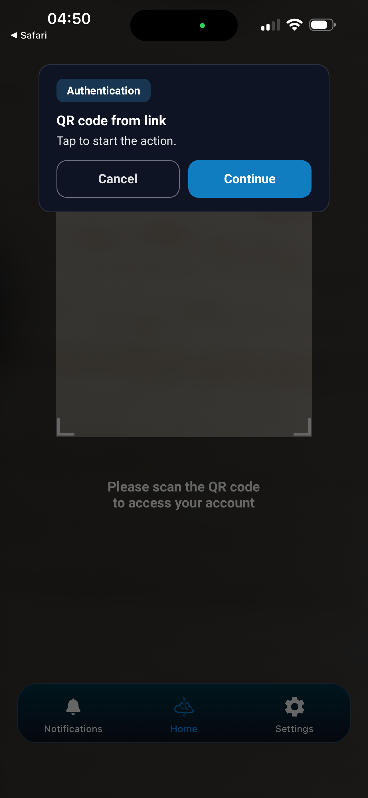 The app's main screen provides a simple interface for scanning QR codes to log in. From here, you can also access your notifications and settings to manage your accounts.